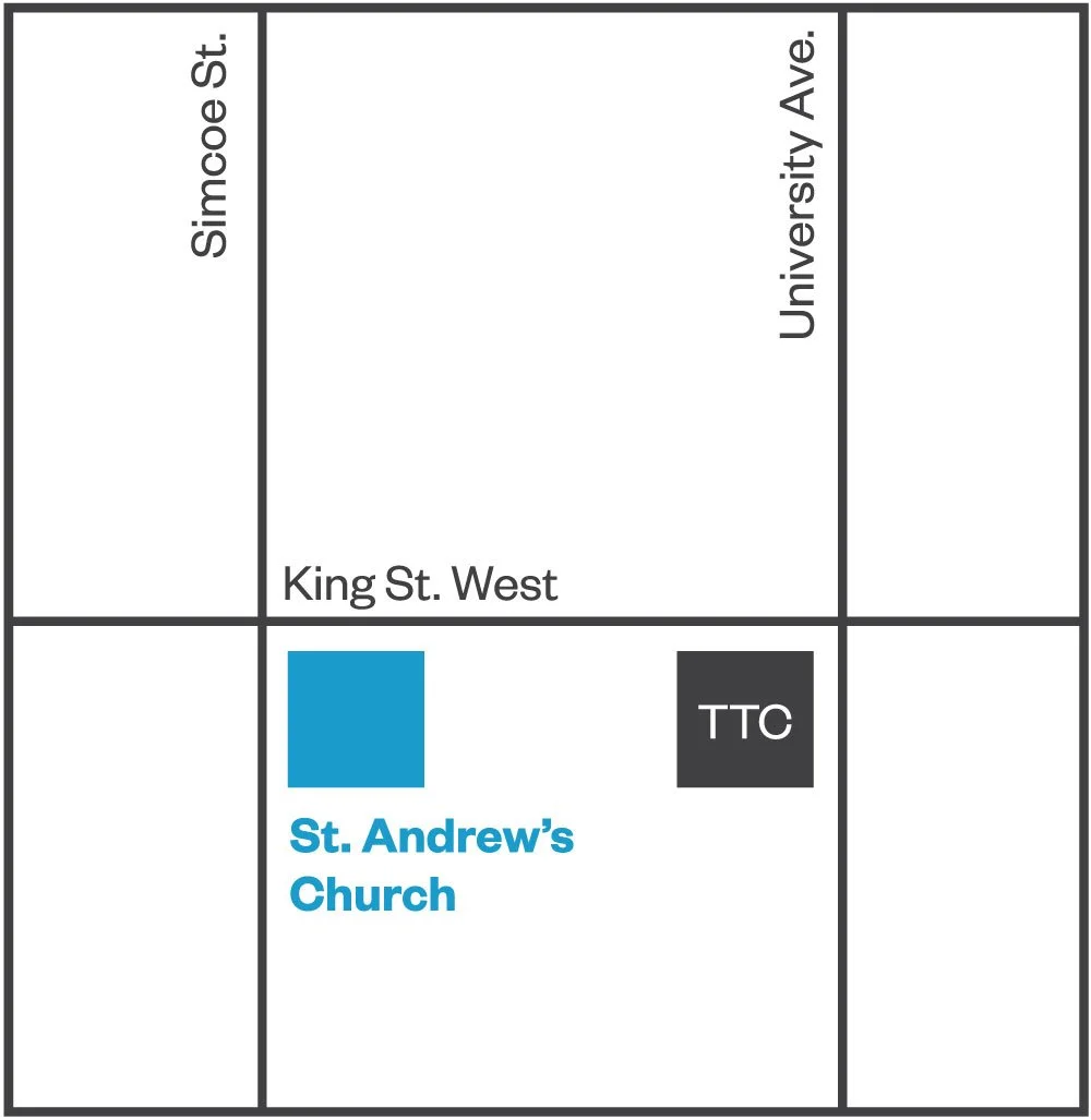 Located on the corner of King St W and Simcoe St, across from Roy Thomson Hall. Steps away from St. Andrew Station (TTC). The main entrance is on King St W. The accessible entrance is on Simcoe St near the rear of the church.