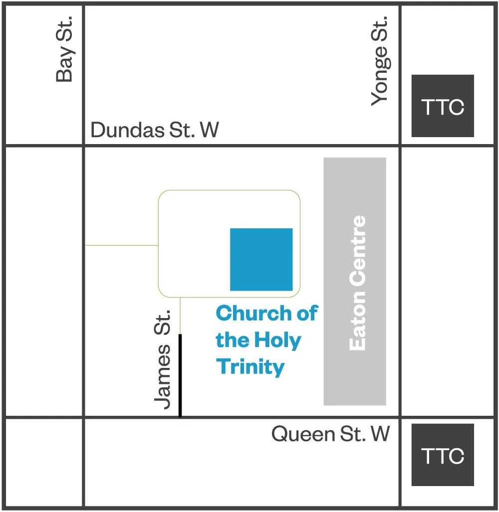 Located just east of Bay St beside the Marriott Hotel and behind the Eaton Centre, a short walk from both Dundas Station and Queen Station (TTC). The accessible entrance is on the south side of the church opposite Trattoria Mercatto restaurant.